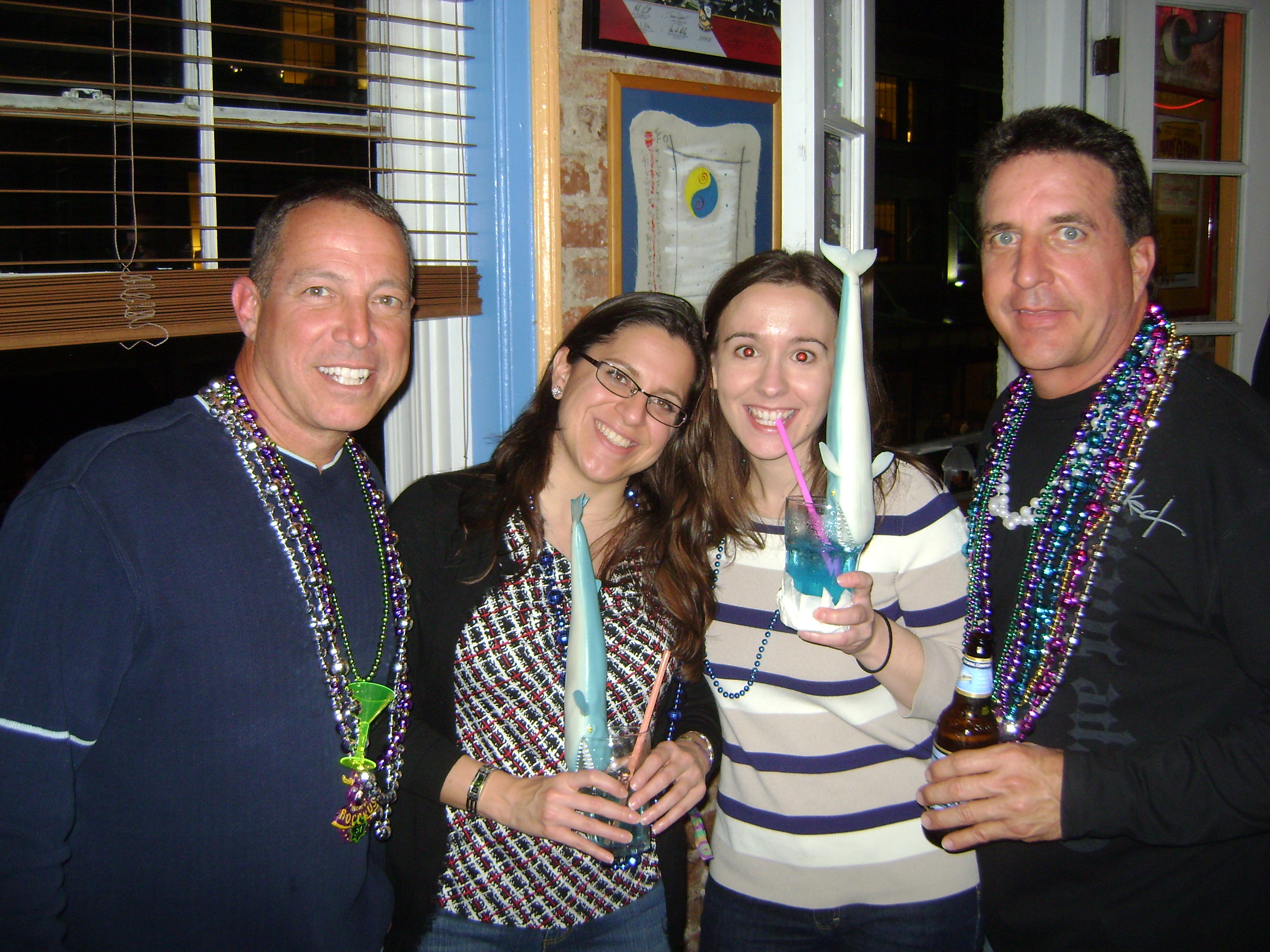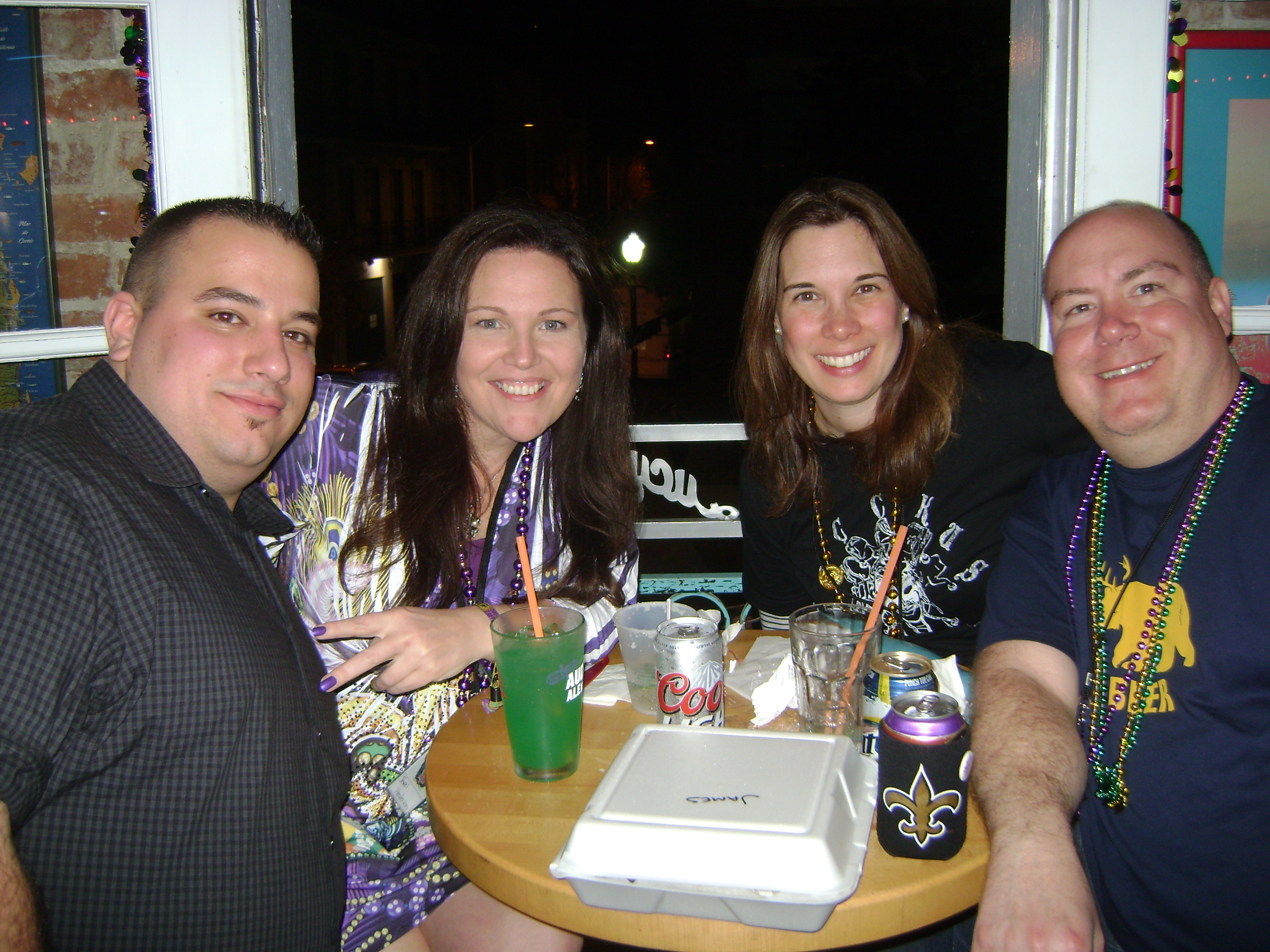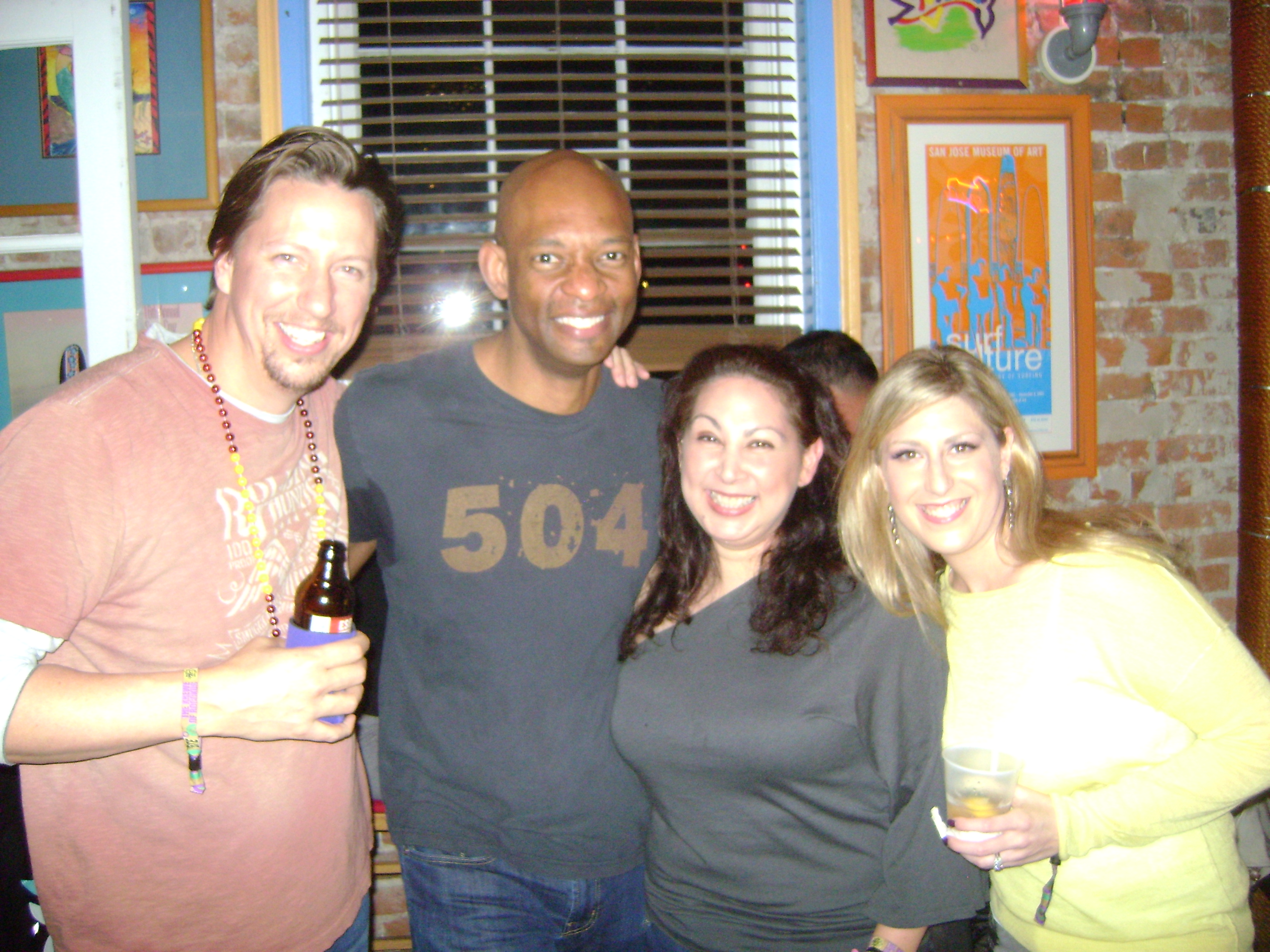 For someone who has a reputation of frequently being late, I sure am aware of time. Some people create a distraction by rolling in to family dinners and public functions infuriatingly late and blissfully unaware. I’m that guy that’s always just ten minutes behind and hates it. I think I have plenty of time to get where I’m going and lose myself in preparation. At some point, though, I inevitably hit a time warp where ten or twenty minutes just disappears into a black hole and suddenly I’m rushing and fussing and stressing and cussing until I roll in at my pre-determined ten-minutes-late time, all apologies and frazzled to the core. So, as usual, last night the Krewe was scheduled to have its first event at 7pm to watch Muses parade during a meet and greet at the upstairs of Lucy’s Retired Surfers Bar (I had no idea surfers could retire let alone why flat & muddy watered New Orleans would be their final resting place!), and I thought I had plenty of time to write and post an entry beforehand; yet at ten till seven last night I was down in the Hilton Starbucks begging and cajoling my computer to upload my photos and text just a bit quicker. Once it posted, having been barely edited (so apologies for typos), I dashed back up to the room, stowed away my laptop, grabbed a beer, dashed back to the elevators, and power-walked to the bar afraid I was going to miss something. Ten minutes late as always.