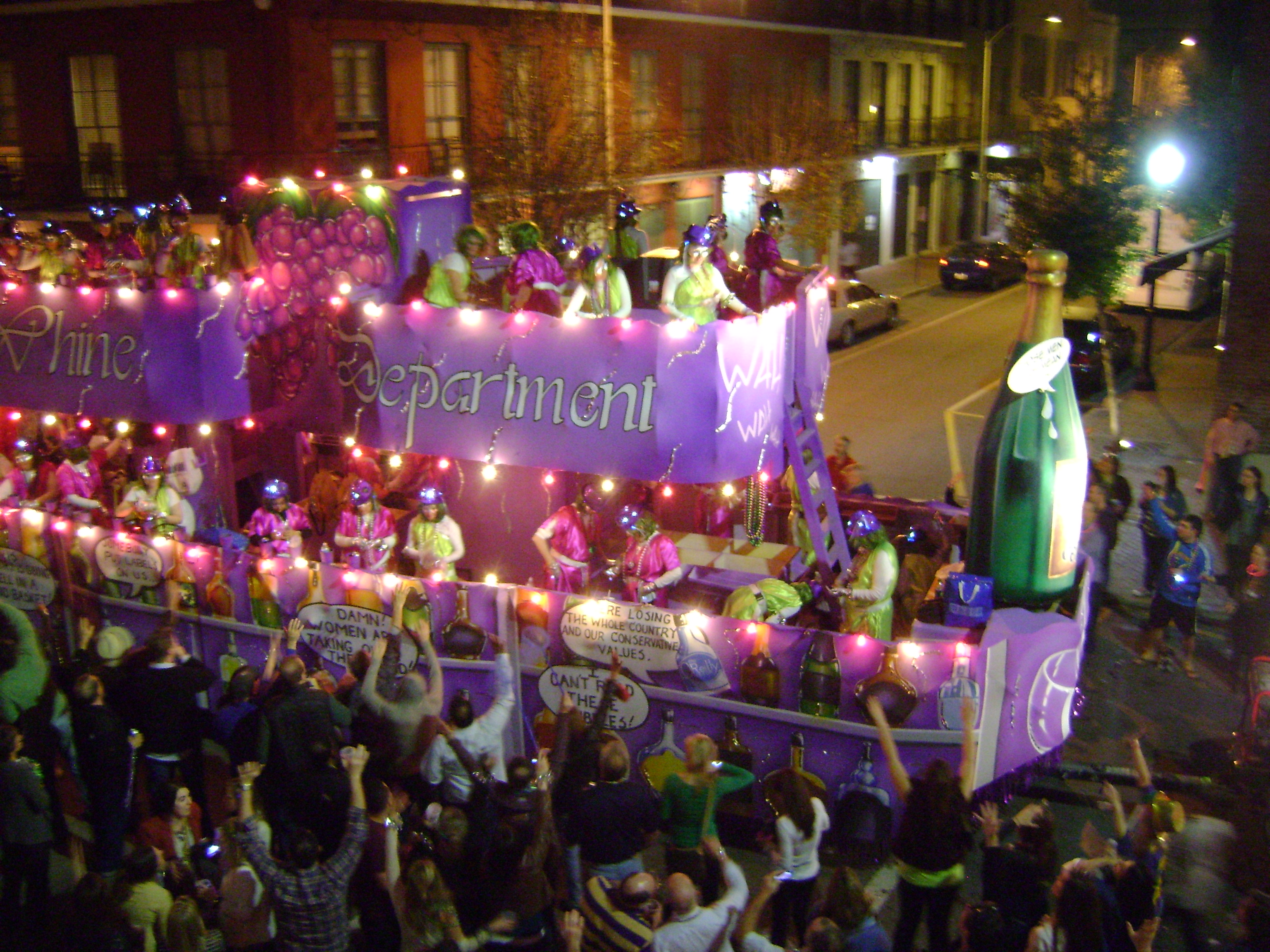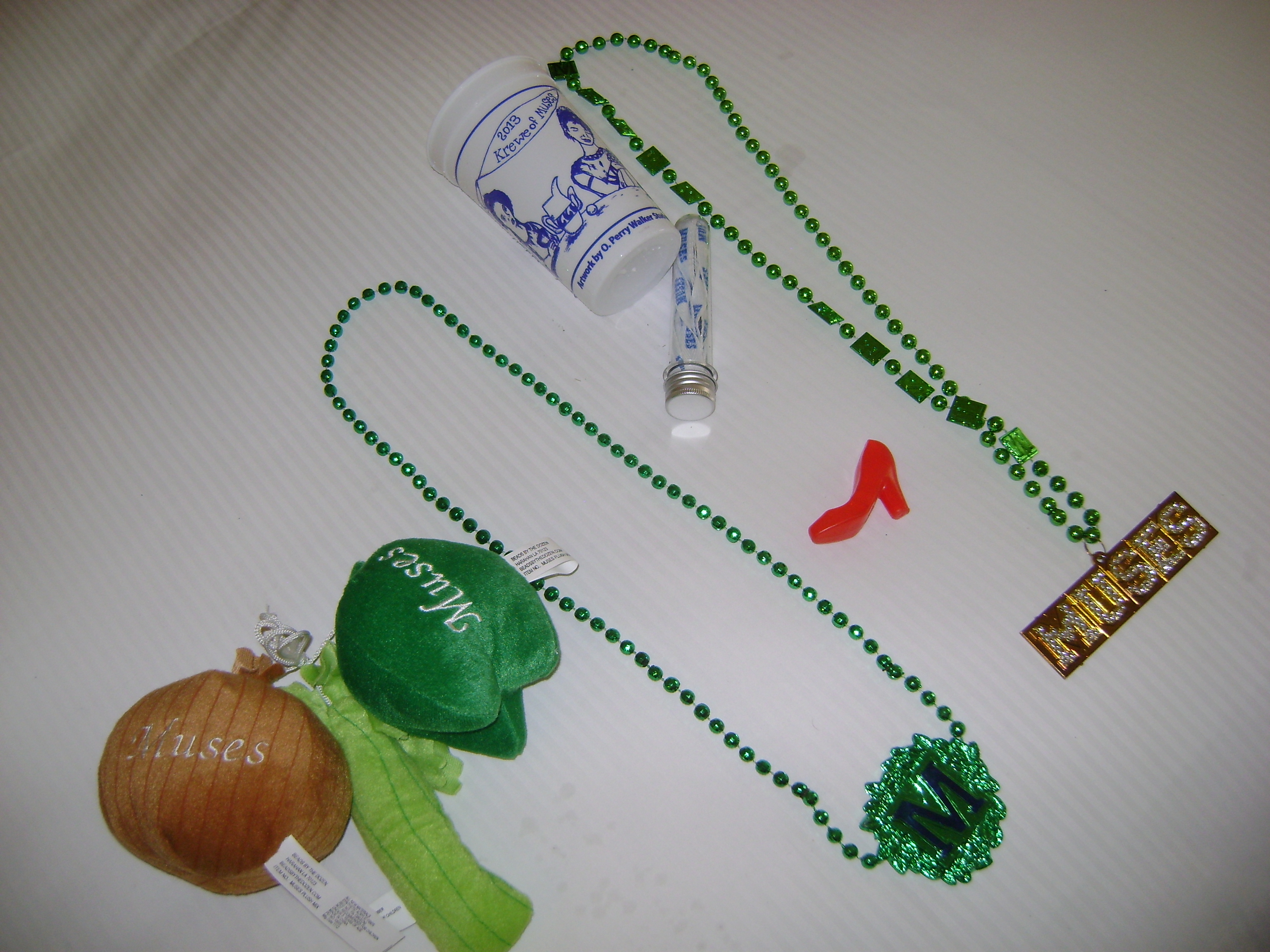 By the time Muses finally rolled, the party was winding down and some of the crowd departed. I felt a little in the know, having already previewed the floats, but did stay out to see what kind of ‘throws’ they were offering. Muses, as I said before, is all female and their symbol is a high heeled shoe. The prize throw from this float is a hand-decorated shoe, though that held little appeal for me, though I did land some shoe-shaped beads and a plastic ice-cube shaped like a shoe. The one throw I aim for at every parade is a medallion. Every floats throws tons of beads and some people go for quantity. I prefer quality. Medallions are beads with a unique plastic plaque attached that is different for every krewe and often different from year to year. These make great souvenirs for each parade and I caught several. Among other unique throws were flashing plastic diamond rings, Muses shoelaces in plastic vials, and a stuffed toy of the Cajun cooking trinity (onion, green pepper and celery.) I’ll have hours of fun playing with those stuffed veggie tales. Of course, I’m sure the fact that these two bulbs and one stick vegetable looked like a flying phallus as it hurled through the air at your wasn’t lost on these satirical sweeties. Oh, those silly Muses.