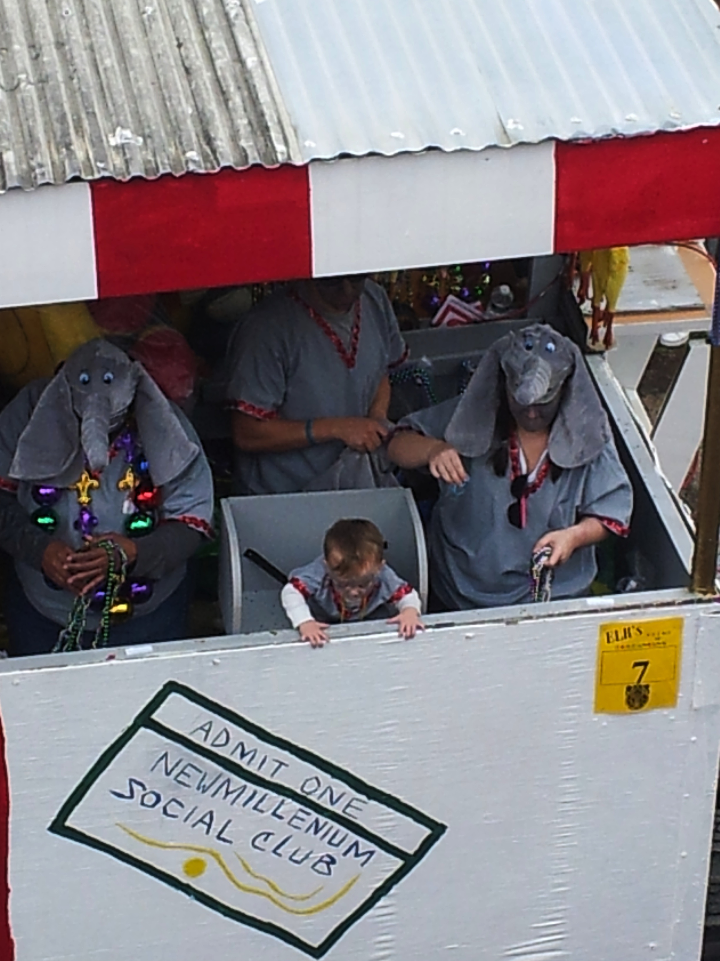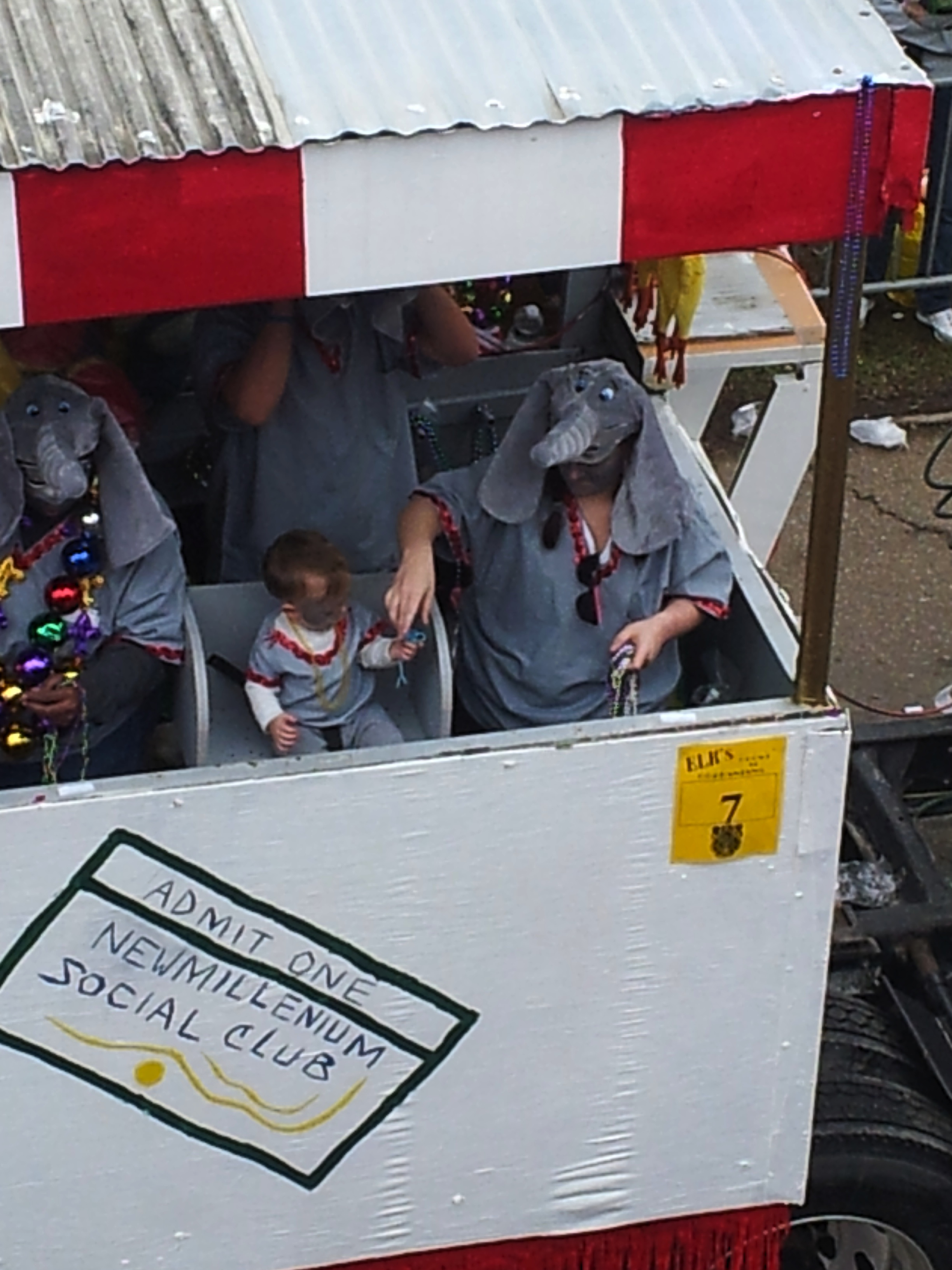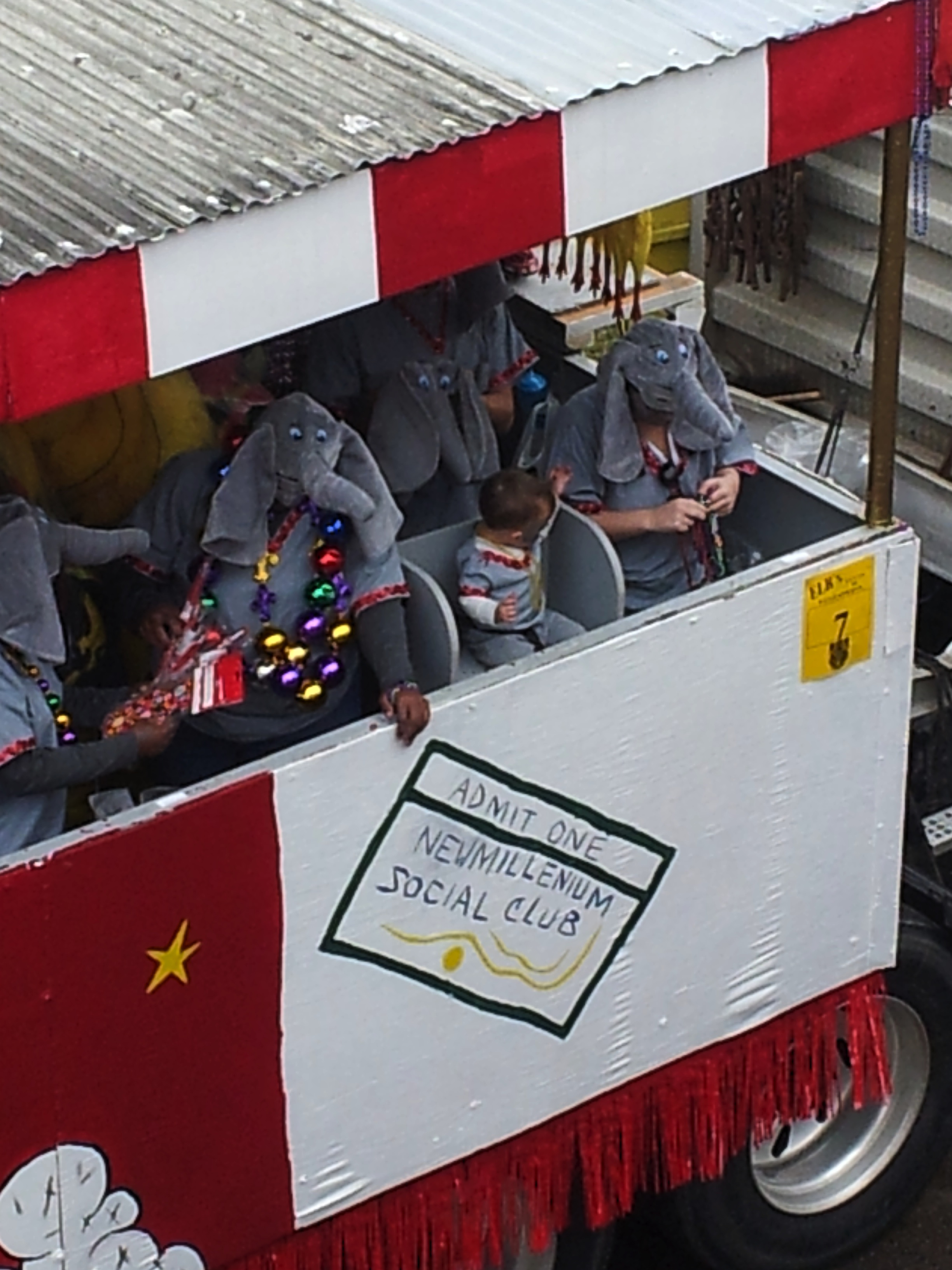 We did, however, catch a couple of sublime moment from our lofty perch. As the rigs relentlessly rolled on, a second tribe of Indians suddenly appeared. We had been looking away and almost missed them, now snapping photos frantically as we did not have time to make it to the the street. Soon after this excitement settled down, Pam pointed excitedly to a passing rig. I was curious, as everything had become repetitive at this point. Looking down, we all began laughing. Someone had engineered a seat for their toddler and taught him to throw beads. It looked like a real-life e-Trade commercial, and even the long-time veterans around me said they’d never seen the like. That baby was throwing with purpose and when his bead supplier in her elephant costume was derelict in her duty, that baby let her know it!