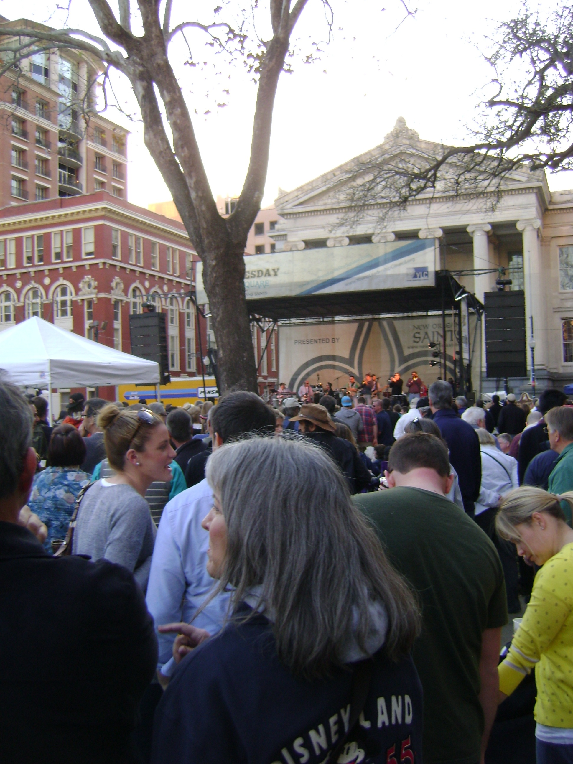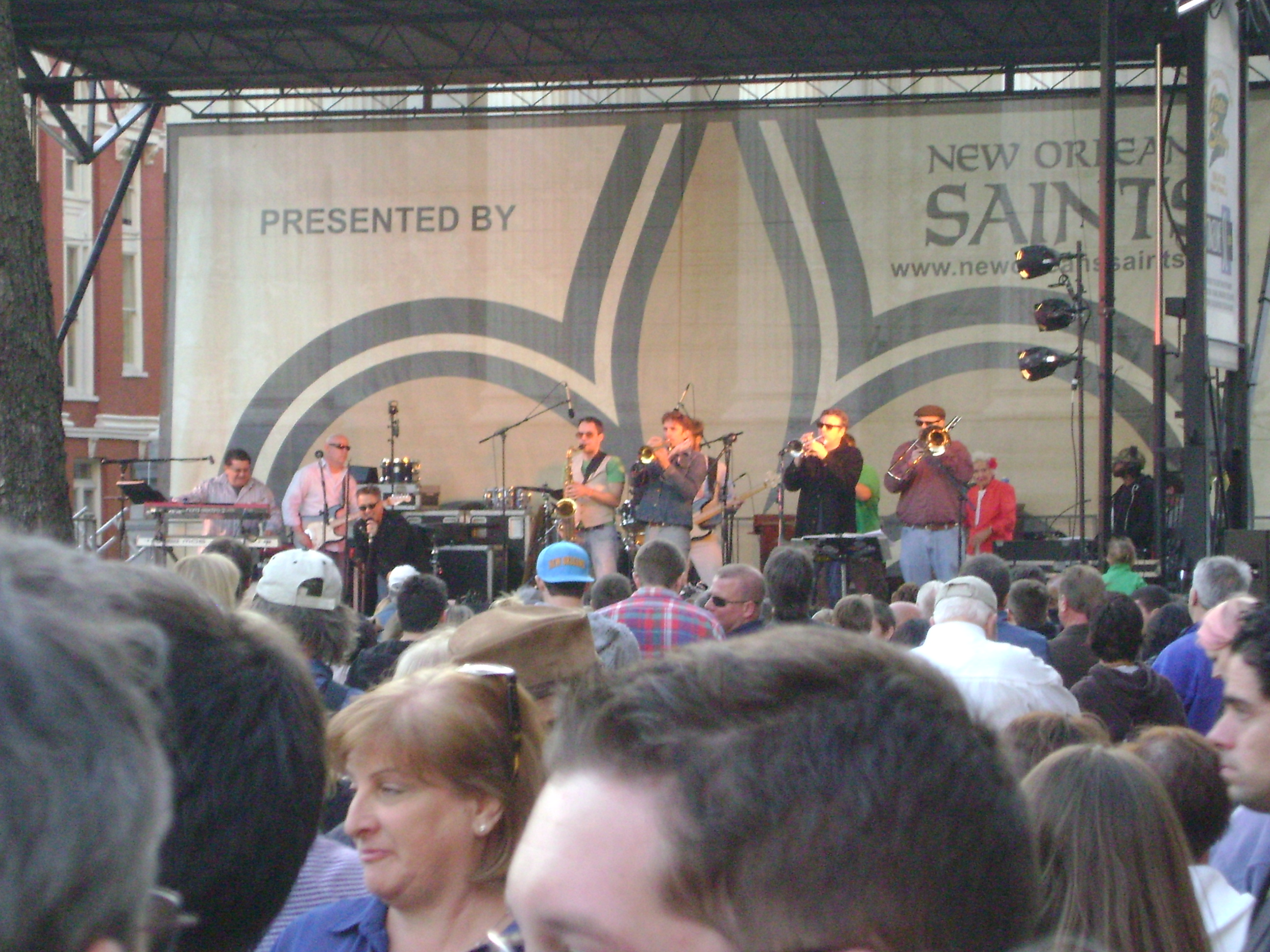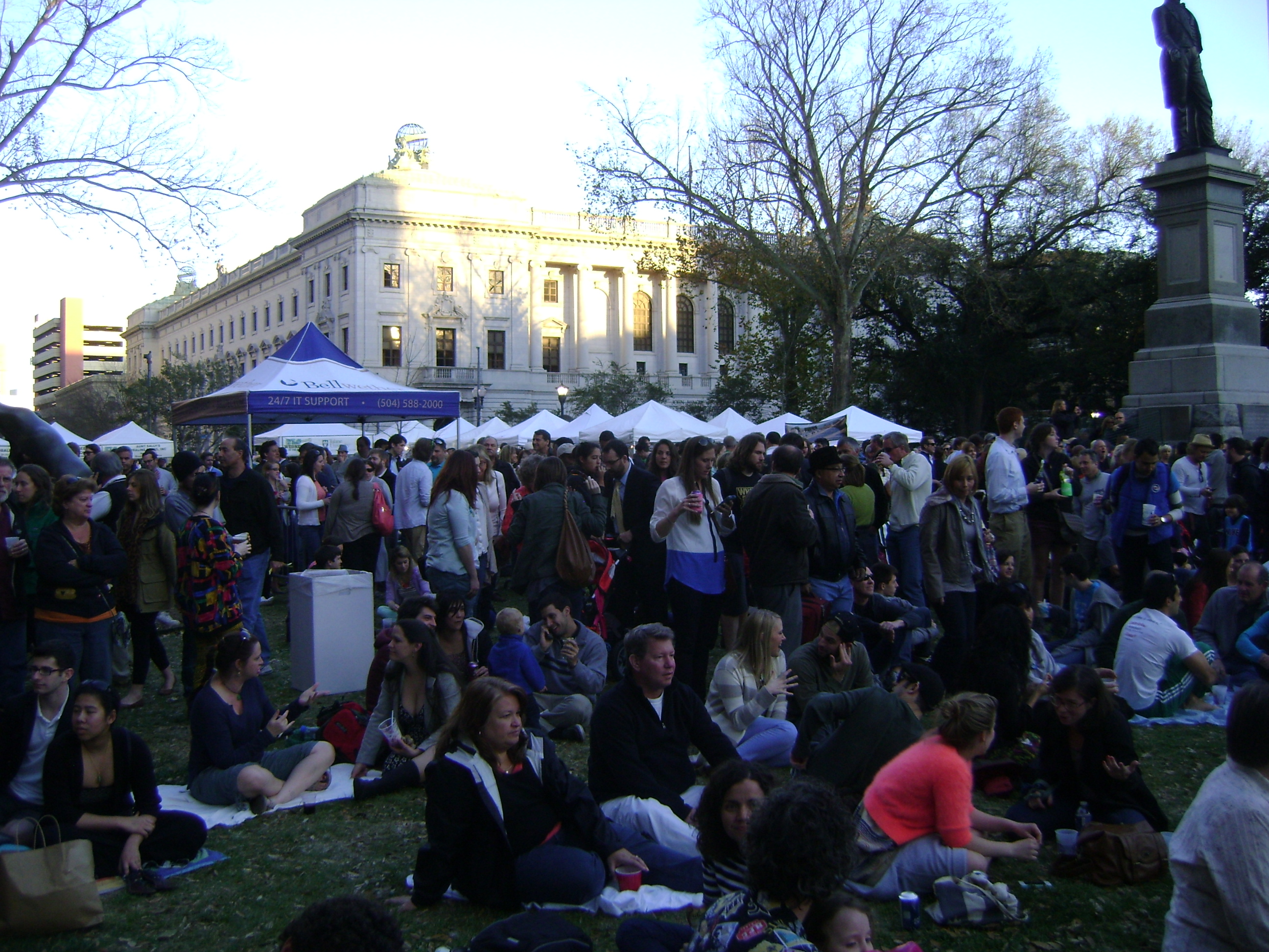 I decided to be eco and urban friendly and take the St. Charles Streetcar, but it was running extremely slow. I waited over half an hour, wishing I had driven, and missed the opening act, arriving nearly an hour late (the streetcar lumbers slowly along once it does arrive). It must not be too difficult for most to get there, however, because the park was packed. Close to the stage people crowded every available space with portable chairs while further back families spread out blankets and clusters of friends mingled. The perimeter was flanked by vendors from popular local restaurants offering upscale festival fare such as freshly made crepes, wine-braised beef sandwiches, and the cognac shrimp with stone-ground goat cheese grits that I later ordered. (It was a grit kind of day and this variation was rich, satisfying, and stuffed with four times as many plump shrimp as the $5 price warranted!)