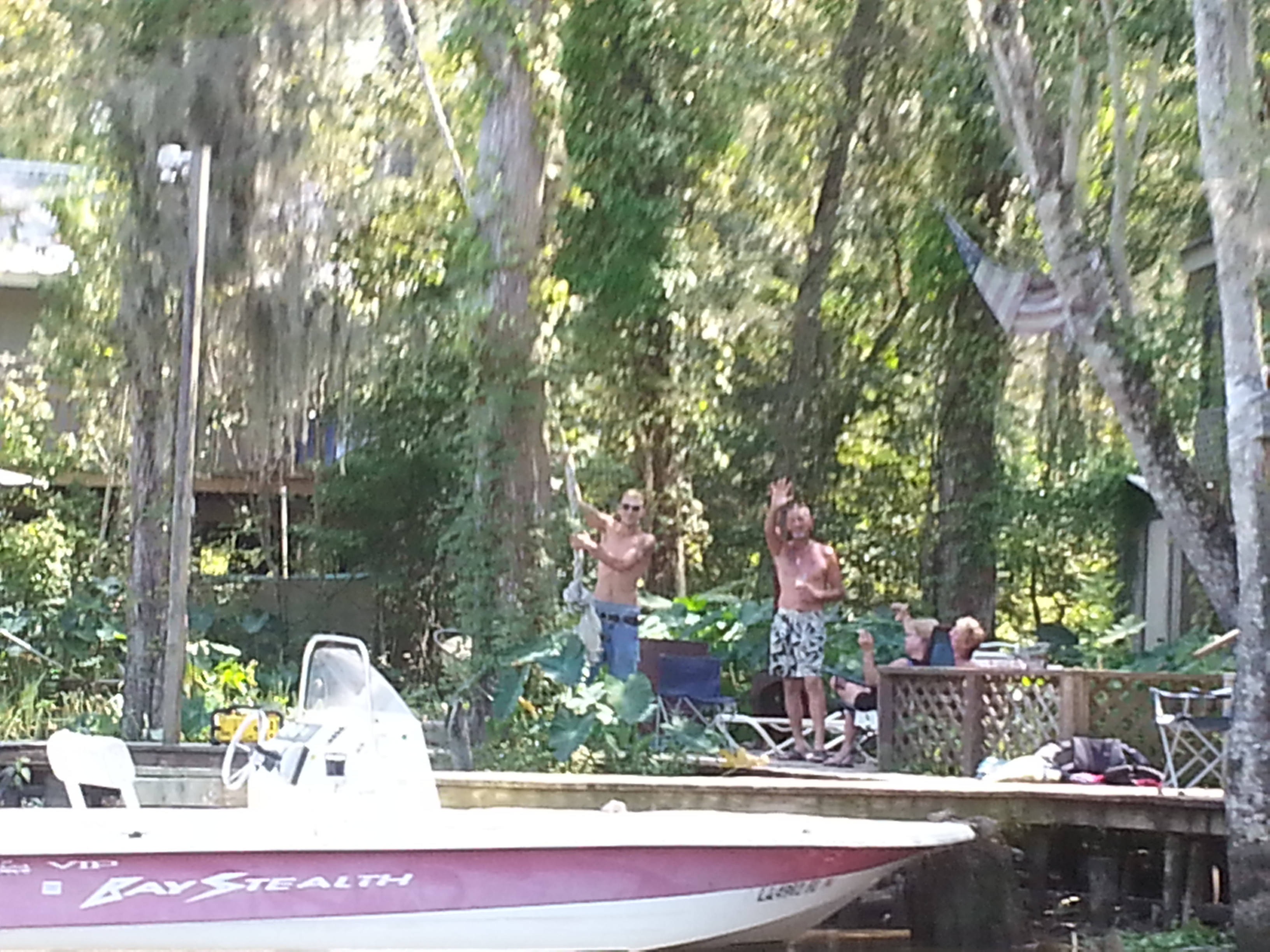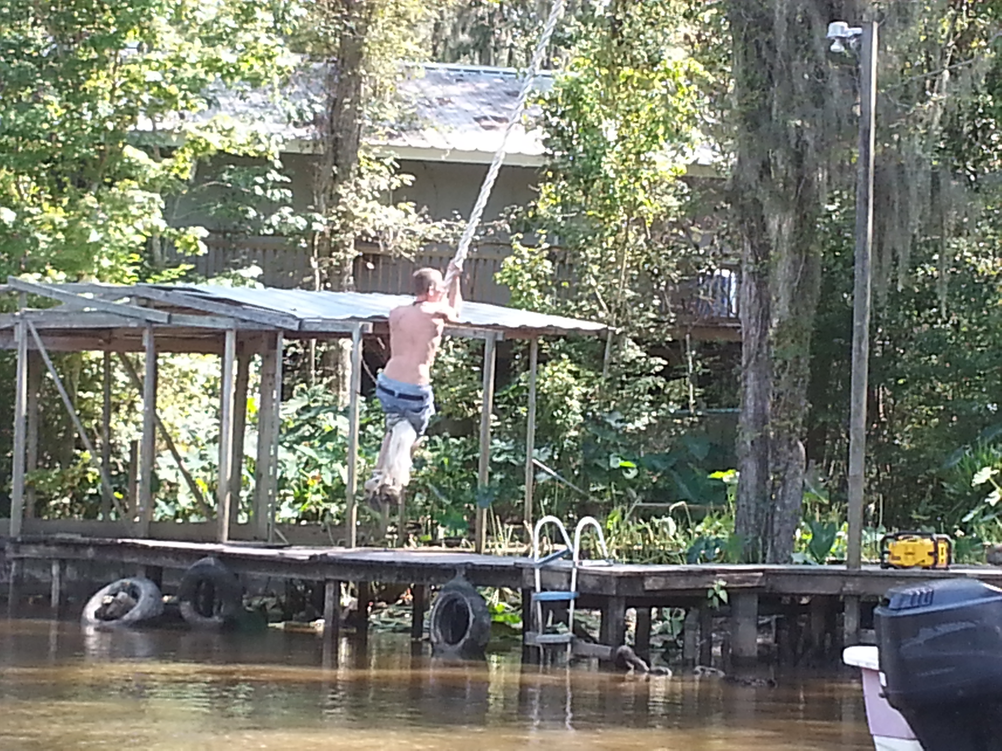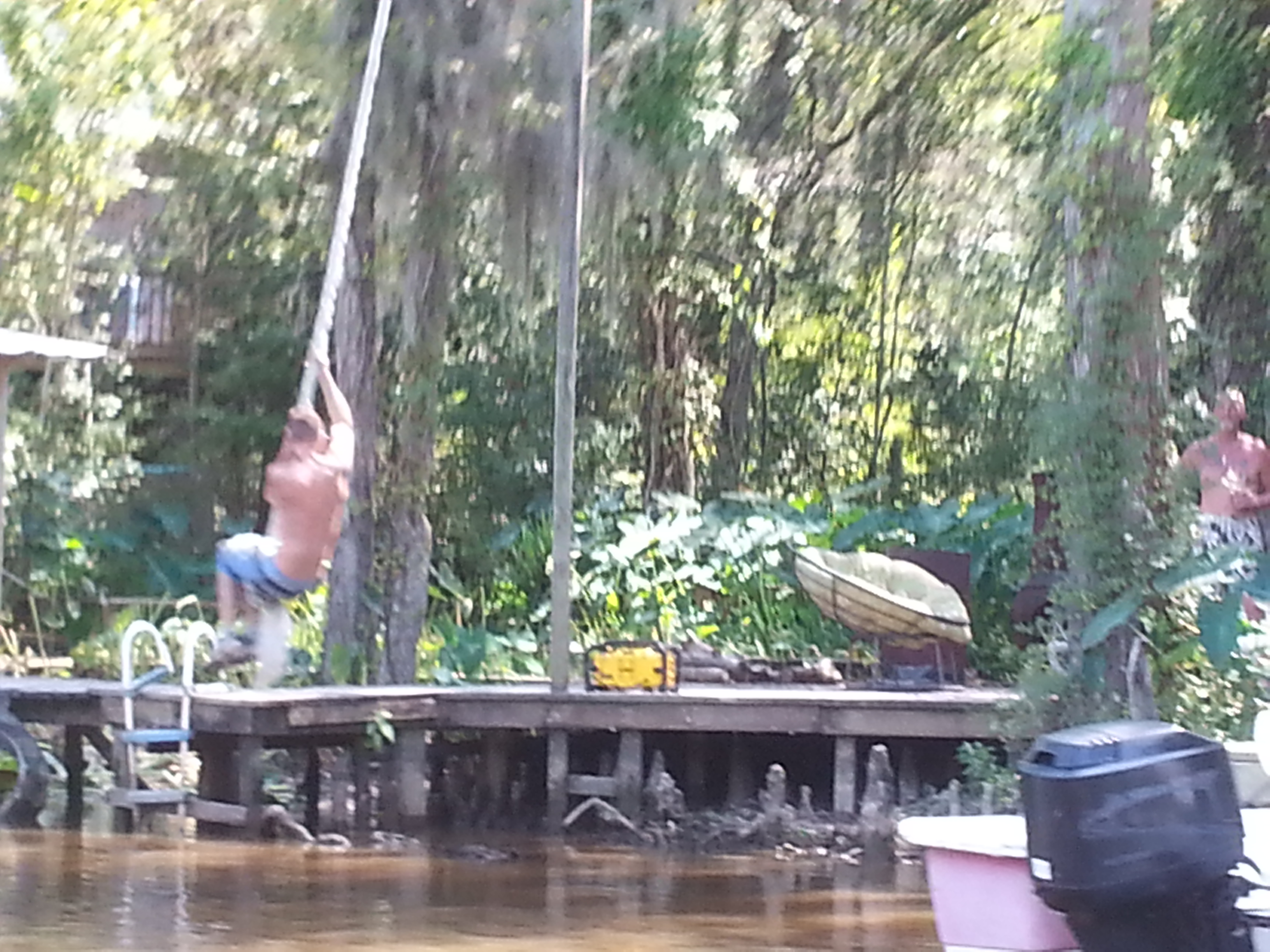 As we trolled the shores unsuccessfully seeking snakes and boars, Brian told a few stories of the deadly water moccasins that infest these waters used by locals for crawfishing, swimming, and skiing. When someone asked about swimming with gators, he shrugged, saying he grew up swimming these waters without incident. As if on cue, we passed a guy swinging out on a rope; however, when everyone cheered him on to let go, he lamely claimed to have a cell phone in his pocket. So, while we failed to spot Sasquatch on the trip (my aunt had requested I go hunting), we did find a timid Tarzan.