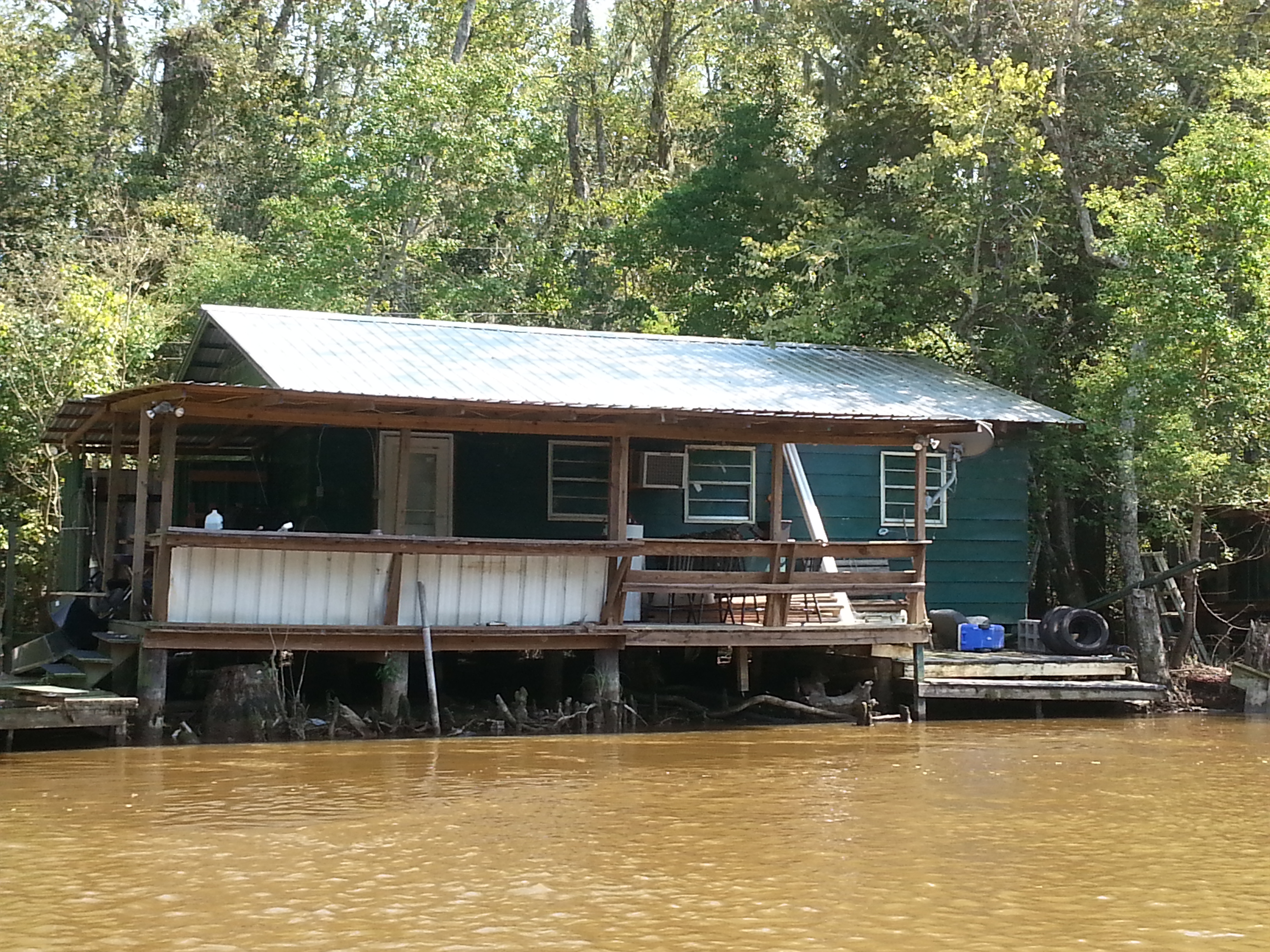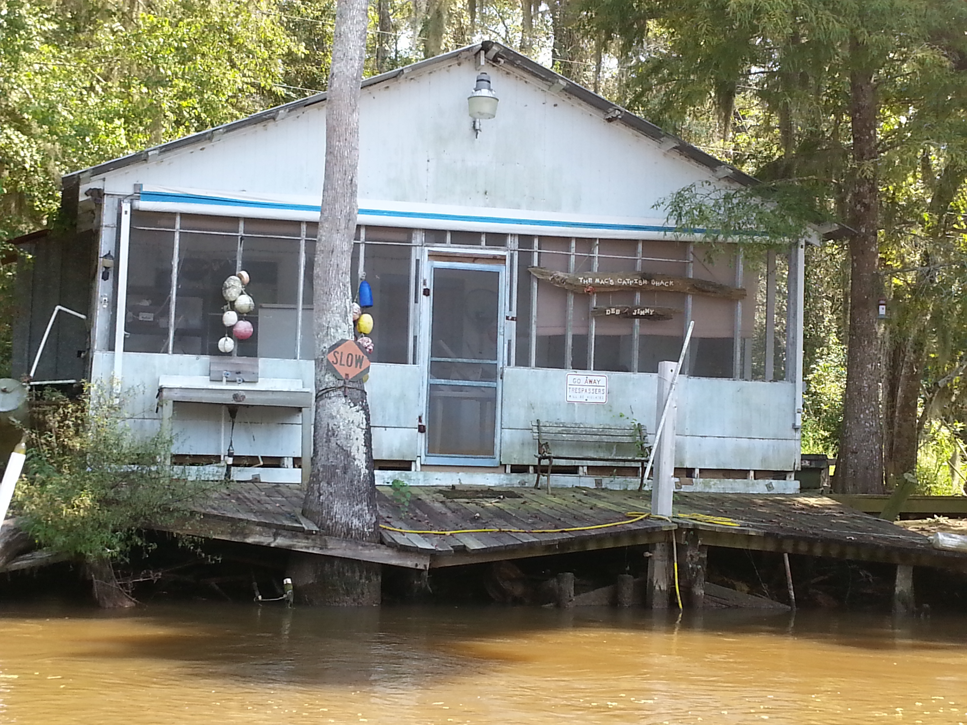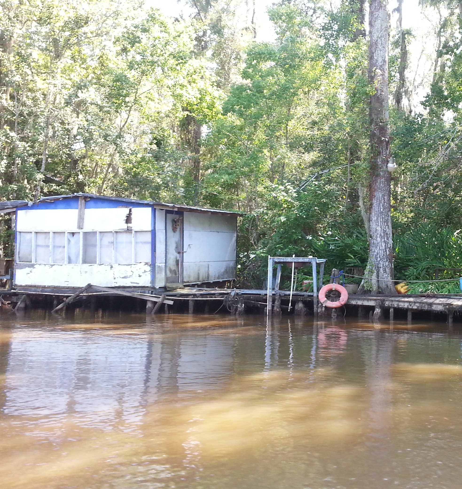 After exploring this secluded back corner, he turned and sped us down wider open bayou as the sun glistened off the water between distant shorelines that were still thick vegetation but could have passed for any river in the south. Stately houses slowly began to disrupt the expanse of green followed by a few fishing cabins. Soon we wandered beyond shores with access roads into a foreign land of shaky river shacks accessible only by boat. This was the site and inspiration for Beasts of the Southern Wild. Many of these structures were abandoned and some remain weekend fishing camps, but a few full-time residents still survive here, working these waters. Per Brian, 30% of the nation’s seafood comes from Louisiana, second only to Alaska, though apparently this has been a rough season for crabs.
