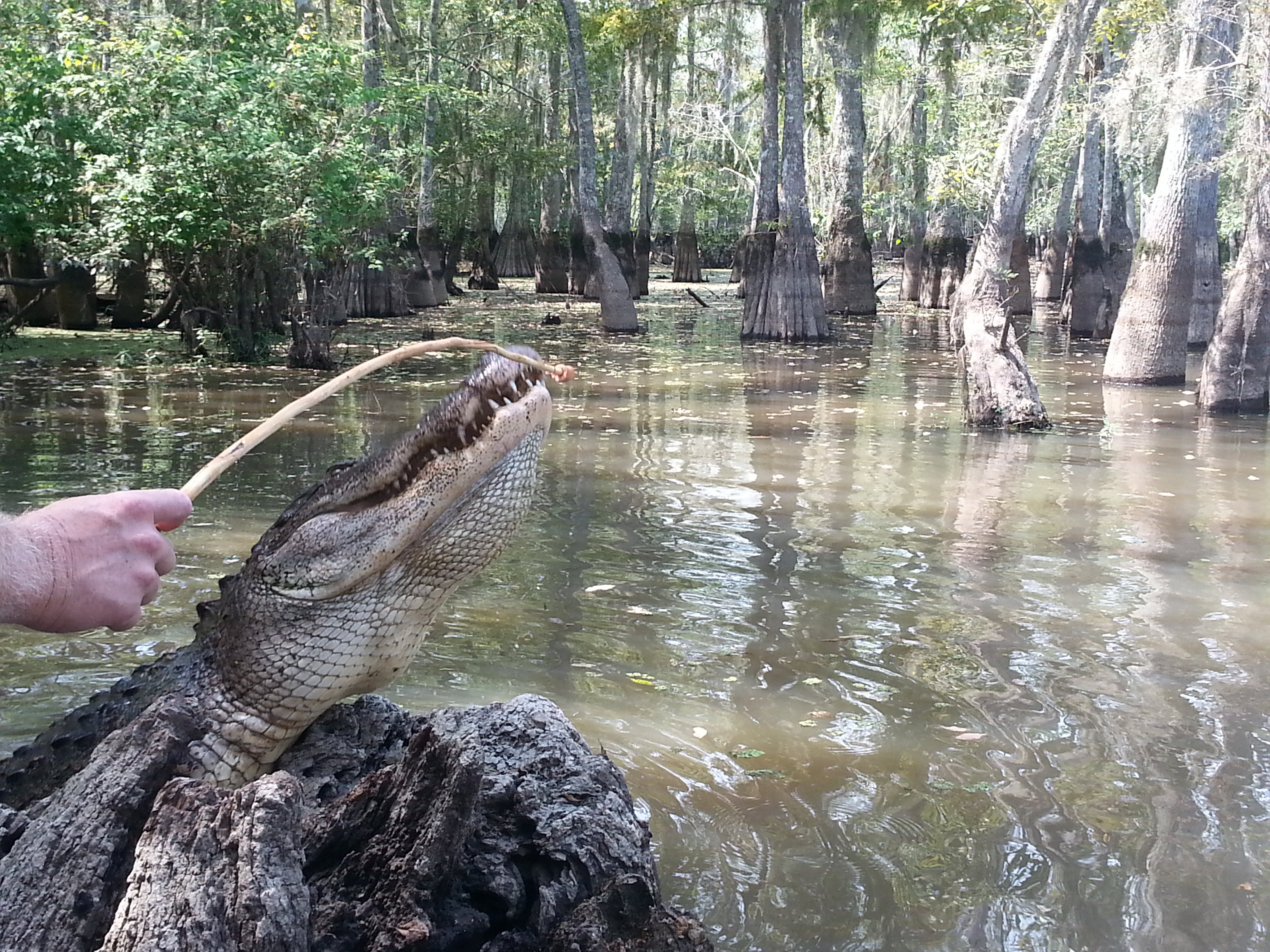 These waters are protected from state-licensed trappers who are currently active (the season runs late August to the end of September) and these gators have become quite tame, swimming towards the sound of our boat (usually not the desired effect!) We quickly learn why. Brian guided their course by tossing marshmallows in the water like tiny white bobbers, positioning them for captivated visitors to snap pictures. The real photo opportunities, though, began when he baited a stick with chunks of hotdog, prompting his more playful friends (Brian knew them by name) to leap out of the water.