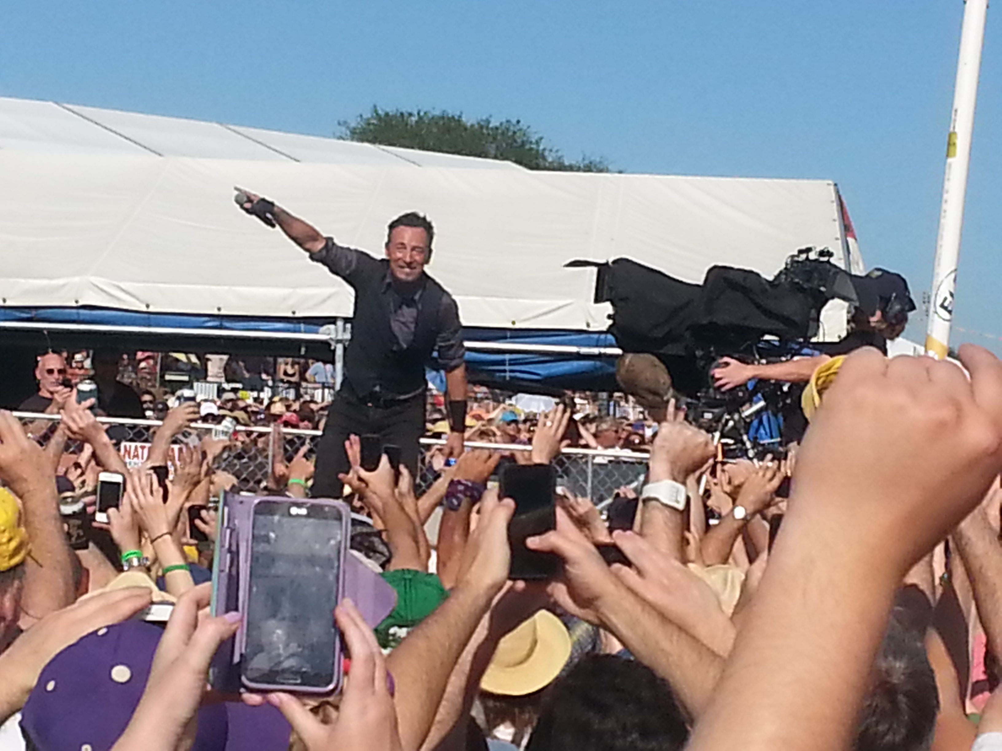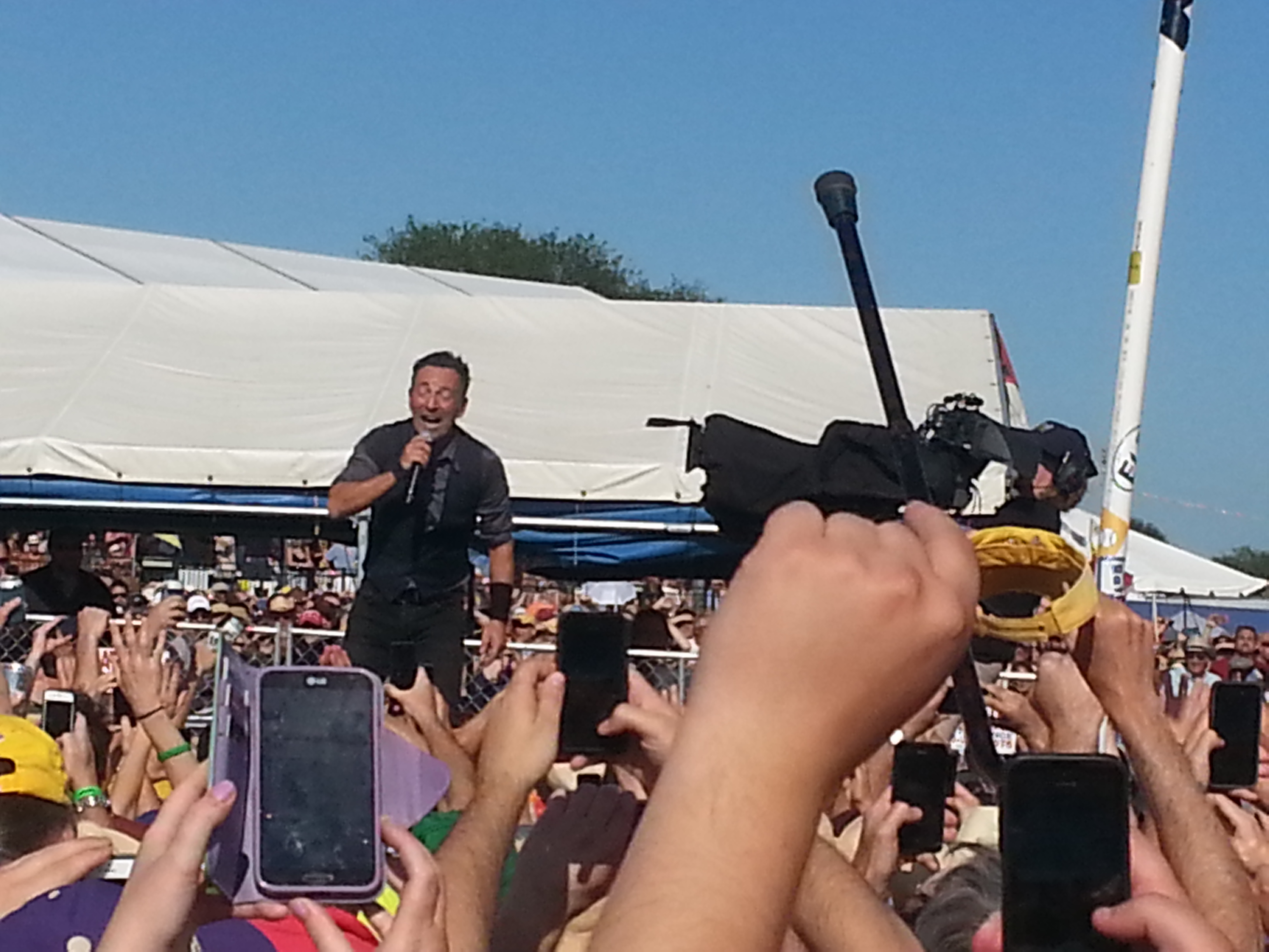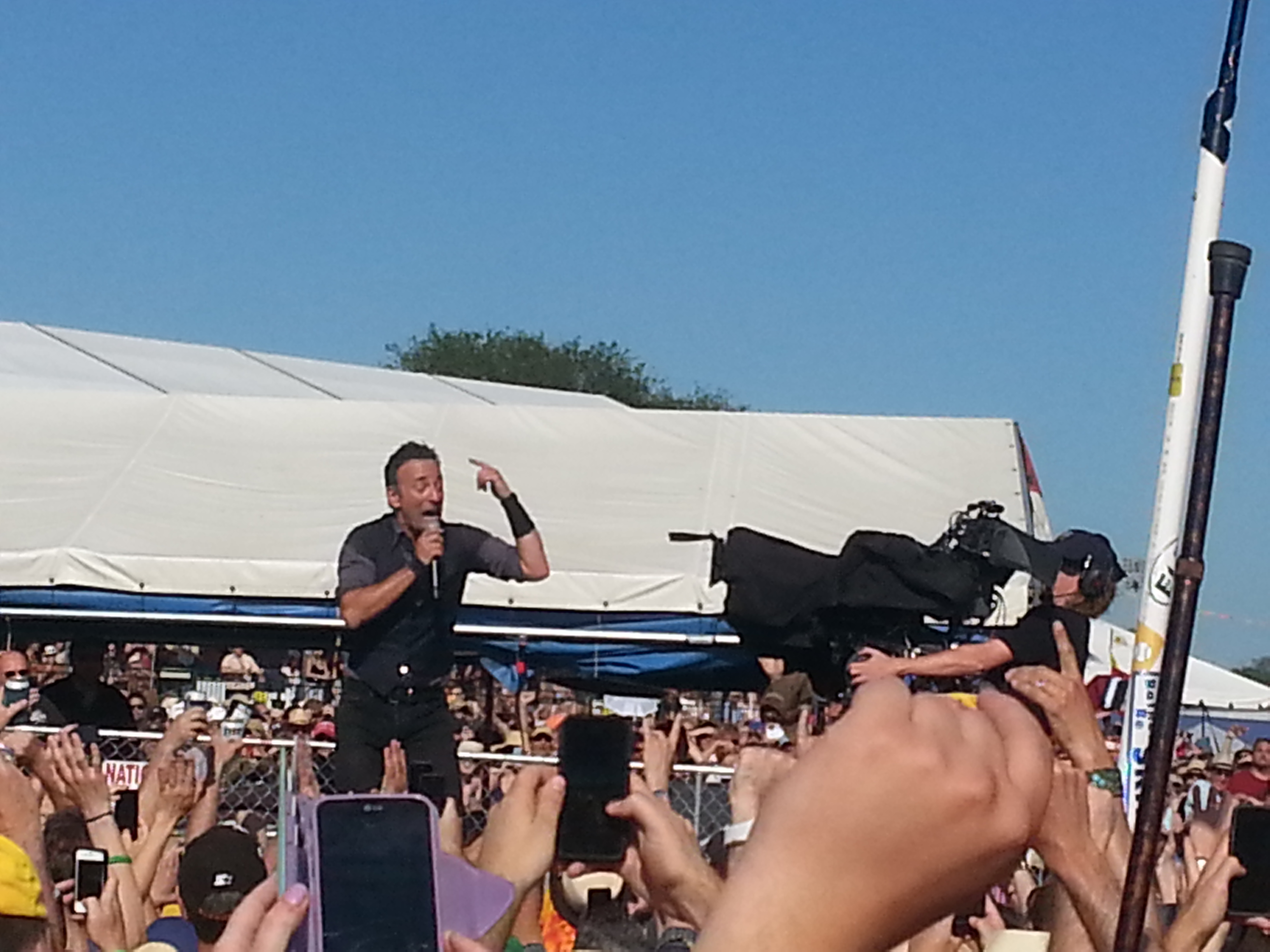 I’ve seen a lot of performances in my life and Bruce is easily one of the top five ever. Few can own a big stage like he can, shrinking a receding crowd of 100,000 fans into an intimate tent revival where he resembles a charismatic country preacher who knows every parishioner by name. I’ve never heard of anyone complaining of him giving less than his best during a show, and he always looks like he’s having the time of his life. At Jazz Fest he was running up and down the walkway stretching through the crowd from stage to sound booth, perching on amps and high-fiving fans. At one point he stopped about 12 yards from where I was buried in the crowd, accepted a beer from a fan, and chugged it as the crowd went wild.