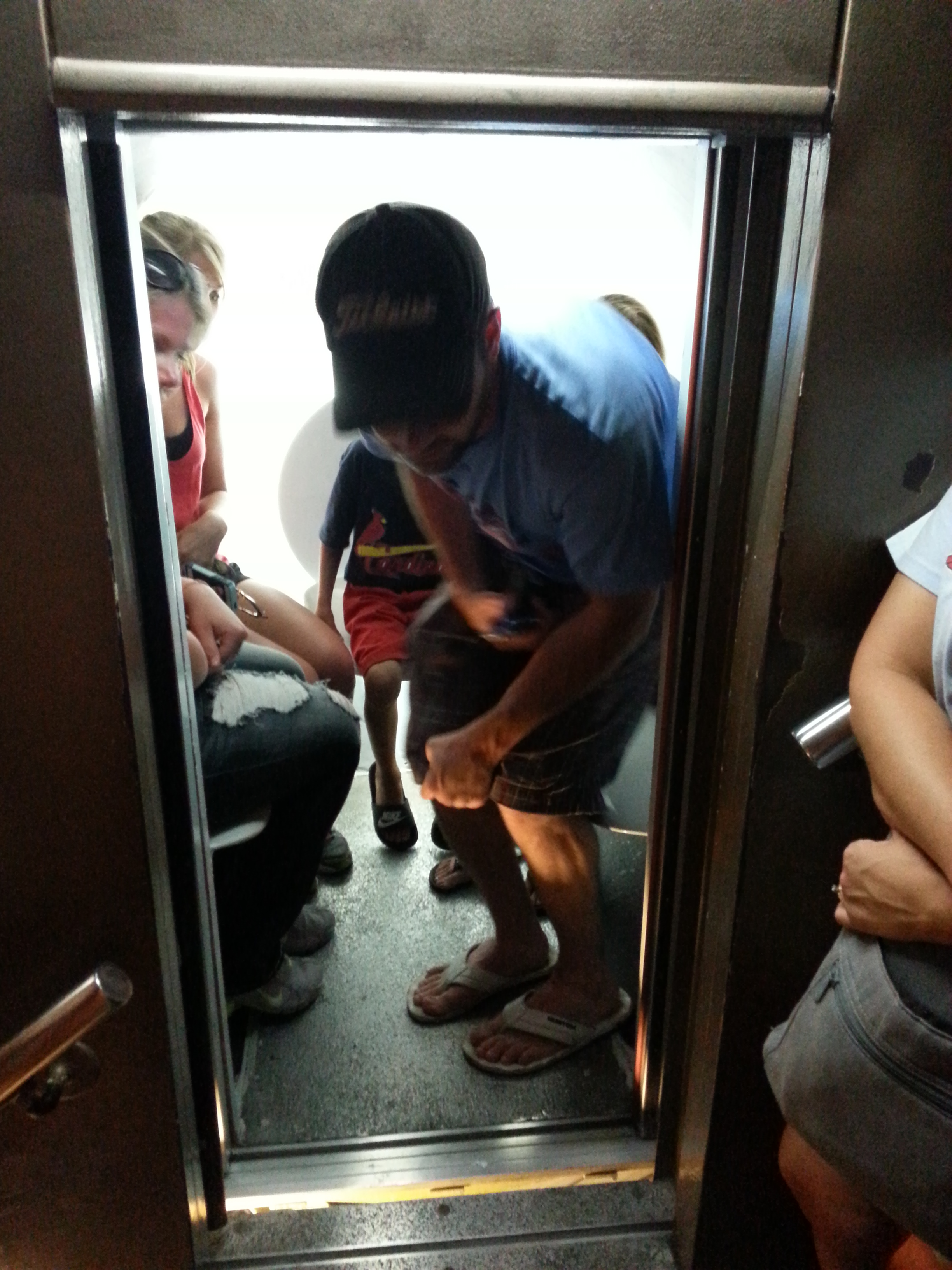 After the jerky ride to the top we were herded into a narrow and chaotic corridor. There was no rhyme or reason to how you progressed; it was simply a narrow, claustrophobic cattle pen with decent views of the city. (The fault of the Arch’s view is that you can’t see the city’s signature—the Arch!) Since it wasn’t clear who was still entering, who was waiting to ride back down, and who was trying to reach the oblong bunker-style windows, you had to muscle in for a view while trying not to hyperventilate in this sky-high mausoleum. Although a visit to the top is practically mandatory, I don’t think I’d opt for a Mulligan.