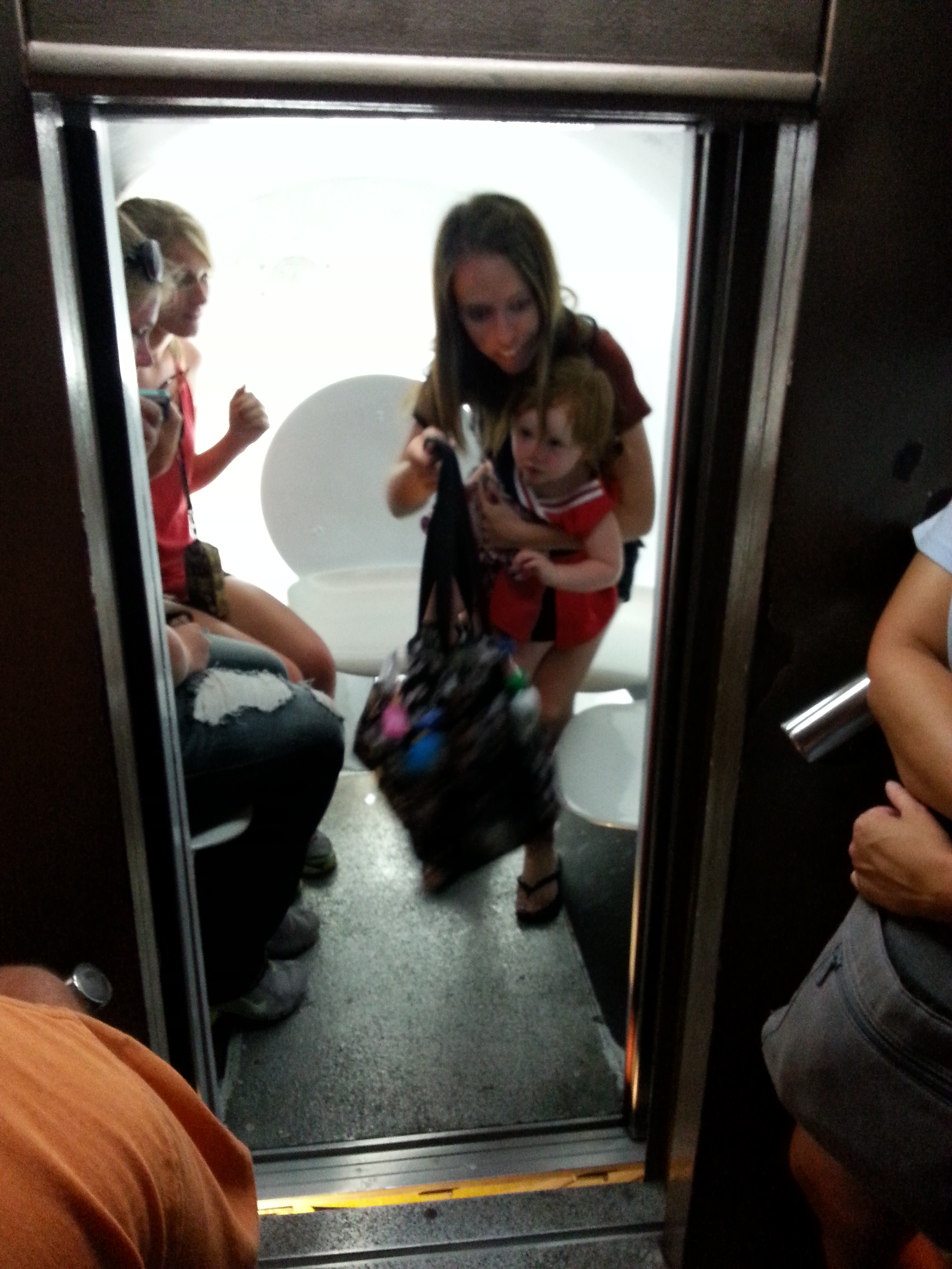 Matt declined to ride to the top again but warned me I’d be crammed in a tiny, awkward capsule with complete strangers. Being a single rider sent me to the front of the line like at Disney where the tiny rounded capsules with their sliding doors that opened with a swoosh looked like something out of Star Trek—a vision of the future out of the dated past. As I crowded in with a group of giggly girls we all posed for a space pod selfie.