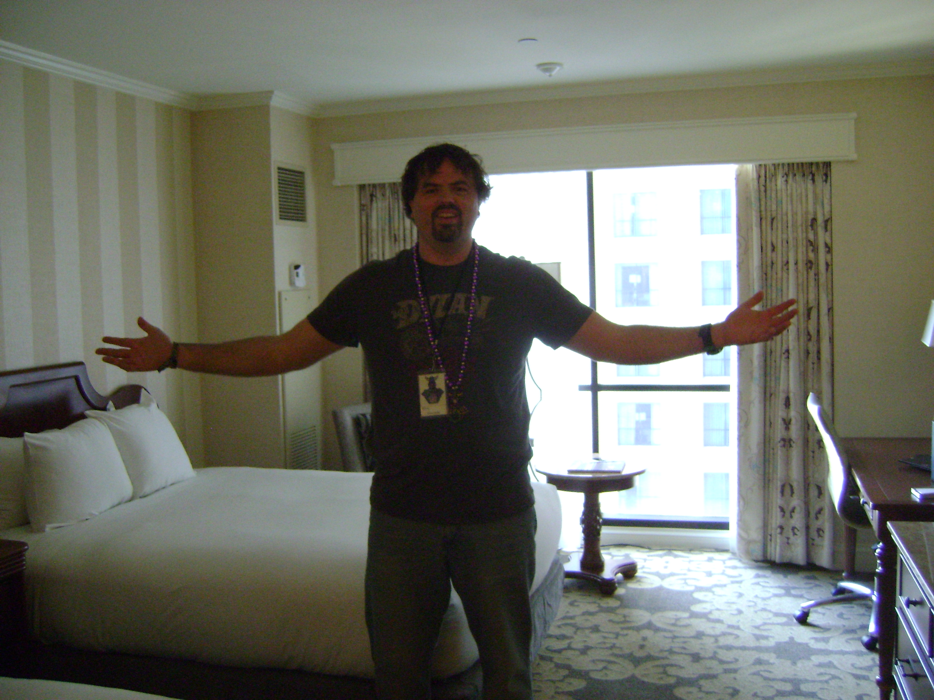 While my brother Jerry was visiting a couple of weeks ago, I dragged him along to play photo journalist during Morpheus ‘pick-up’ day at Plush Appeal. I’d decided to forego the $360 package, but still spent well over $200 piecing together logo novelties and extra plush throws. I could have gotten generic plush toys and beads for cheaper, but for me a lot of the fun is catching a specialty souvenir from each parade. It’s a ton of fun catching big and elaborate beads, and I still cherish the Saints beads I caught one year, but couldn’t tell you at which parade. Over time you forget even where the gargantuan beads came from, but a logo and date will bring a smile to your face and flush of memories every time. Still I’d saved money by ordering only 3 bags of the specialty Morpheus beads with blue and silver moons and stars, and no medallions were available for ala carte, which was a bummer.